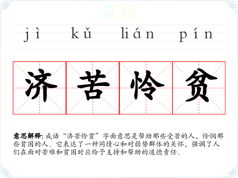 成语“济苦怜贫”字面意思是帮助那些受苦的人,怜悯那些贫困的人。它表达了一种同情心和对弱势群体的关怀,强调了人们在面对苦难和贫困时应给予支持和帮助的道德责任。