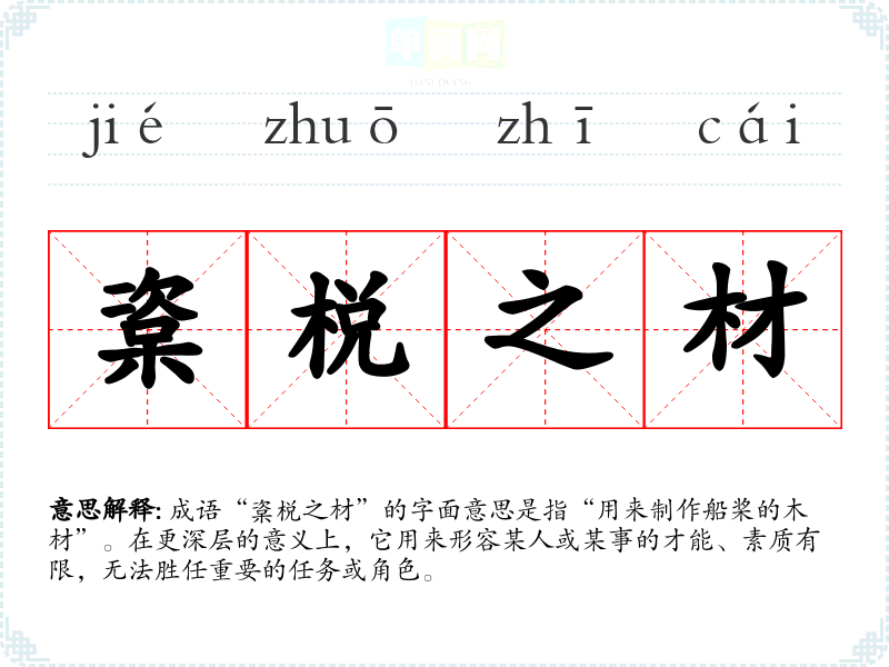 成语“楶棁之材”的字面意思是指“用来制作船桨的木材”。在更深层的意义上,它用来形容某人或某事的才能、素质有限,无法胜任重要的任务或角色。