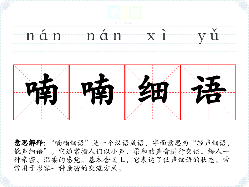 “喃喃细语”是一个汉语成语,字面意思为“轻声细语,低声细语”。它通常指人们以小声、柔和的声音进行交谈,给人一种亲密、温柔的感觉。基本含义上,它表达了低声细语的状态,常常用于形容一种亲密的交流方式。