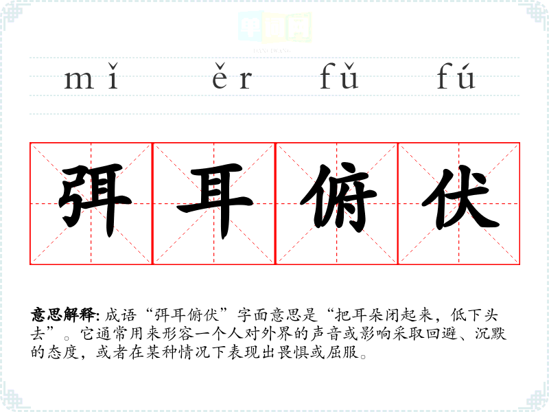 成语“弭耳俯伏”字面意思是“把耳朵闭起来,低下头去”。它通常用来形容一个人对外界的声音或影响采取回避、沉默的态度,或者在某种情况下表现出畏惧或屈服。