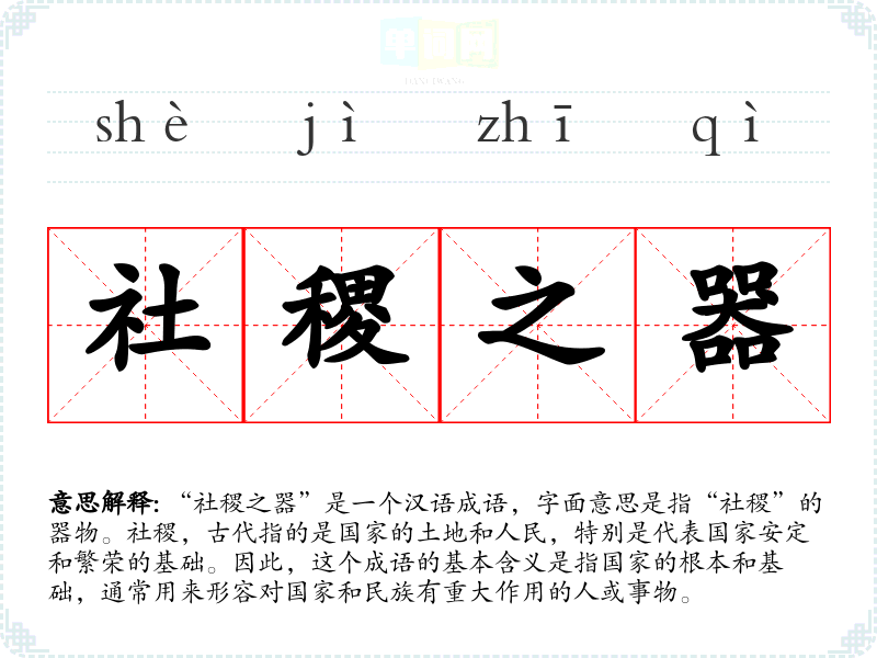 在**传统文化中,社稷代表着国家的安全和稳定,反映了古人对国家与社会的责任感。现代社会中,这个成语仍然适用,尤其在国家建设和社会发展的讨论中,鼓励个体在集体中发挥作用。