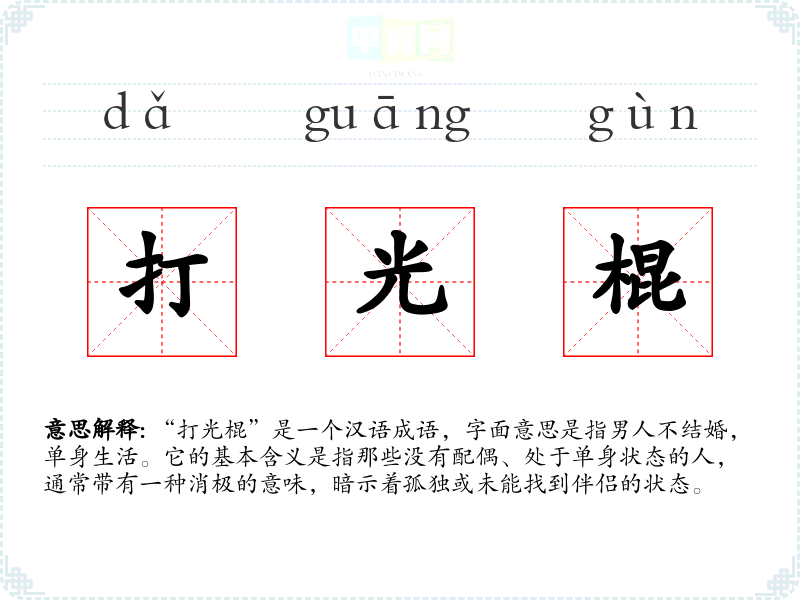 “打光棍”是一个汉语成语,字面意思是指男人不结婚,单身生活。它的基本含义是指那些没有配偶、处于单身状态的人,通常带有一种消极的意味,暗示着孤独或未能找到伴侣的状态。