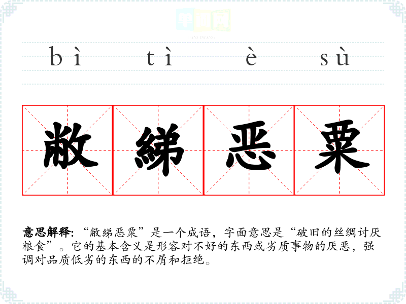 “敝綈恶粟”是一个成语,字面意思是“破旧的丝绸讨厌粮食”。它的基本含义是形容对不好的东西或劣质事物的厌恶,强调对品质低劣的东西的不屑和拒绝。
