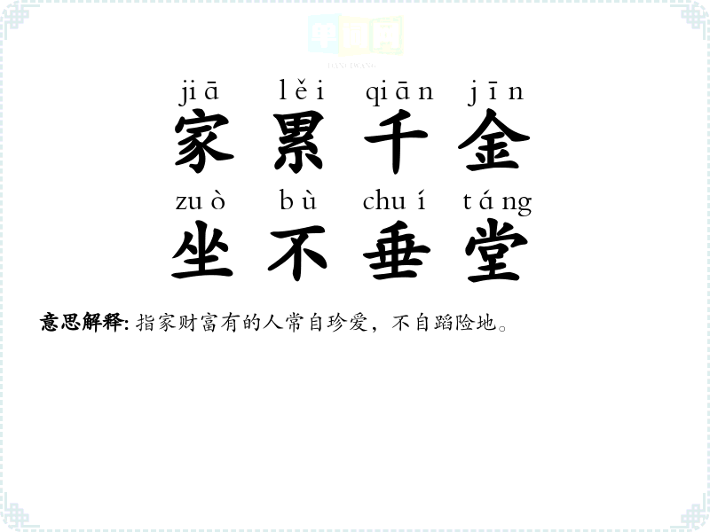 | 千金之子,坐不垂堂 | 垂堂:靠近屋檐的地方。家有千金的人不在屋檐下停留。形容有钱人非常看中自己的身体。 |