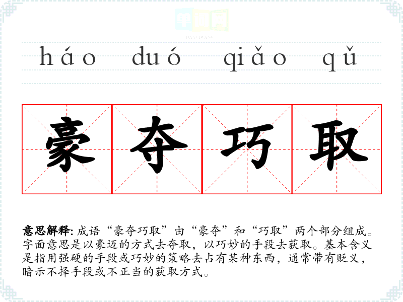 成语“豪夺巧取”由“豪夺”和“巧取”两个部分组成。字面意思是以豪迈的方式去夺取,以巧妙的手段去获取。基本含义是指用强硬的手段或巧妙的策略去占有某种东西,通常带有贬义,暗示不择手段或不正当的获取方式。