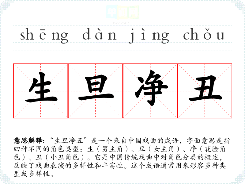 “生旦净丑”是一个来自戏曲的成语,字面意思是指四种不同的角色类型:生(男主角)、旦(女主角)、净(花脸角色)、丑(小丑角色)。它是传统戏曲中对角色分类的概述,反映了戏曲表演的多样性和丰富性。这个成语通常用来形容多种类型或多样性。