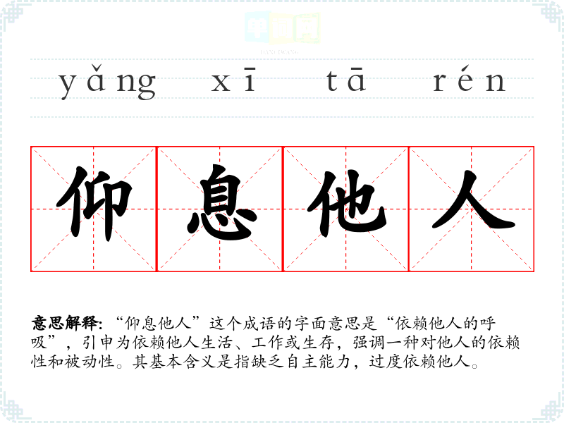 “仰息他人”这个成语的字面意思是“依赖他人的呼吸”,引申为依赖他人生活、工作或生存,强调一种对他人的依赖性和被动性。其基本含义是指缺乏自主能力,过度依赖他人。