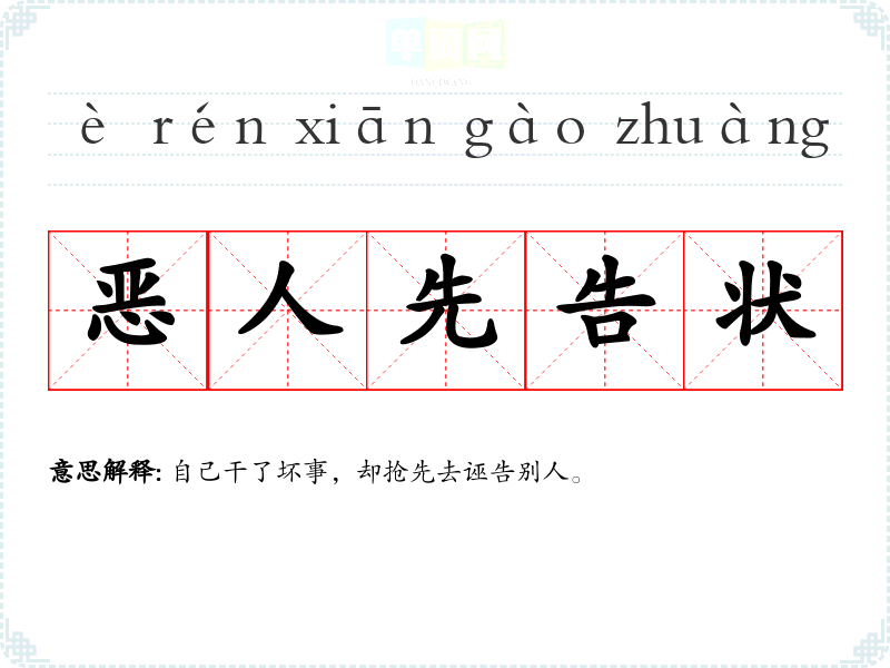 | 恶人先告状 | 自己干了坏事,却抢先去诬告别人。 |