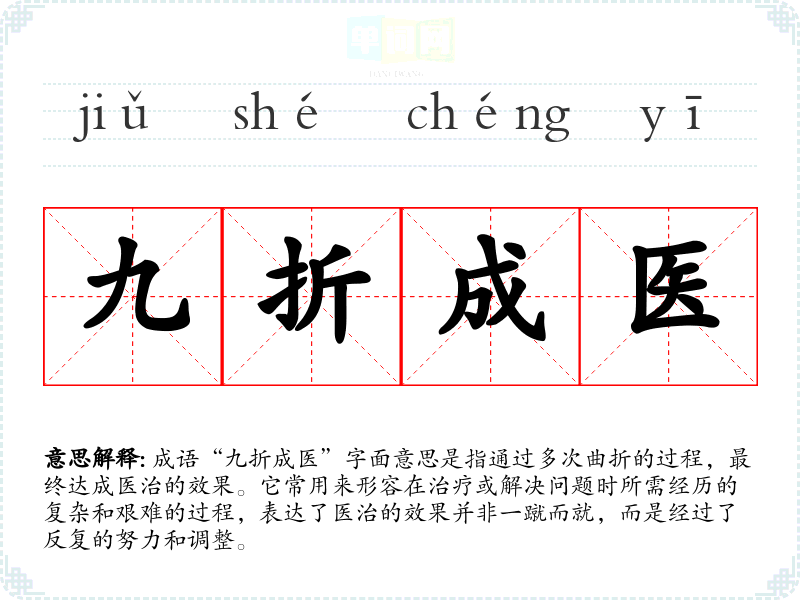 “九折成医”源于古代医学发展中的一种比喻,强调医学的复杂性和治病救人的艰辛。这个成语最初可能与古代中医的治疗过程有关,古代医者常常需要通过多种方法和尝试,才能找到合适的治疗方案。