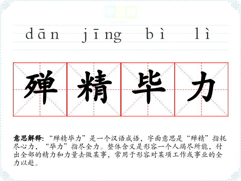 “殚精毕力”是一个汉语成语,字面意思是“殚精”指耗尽心力,“毕力”指尽全力。整体含义是形容一个人竭尽所能,付出全部的精力和力量去做某事,常用于形容对某项工作或事业的全力以赴。