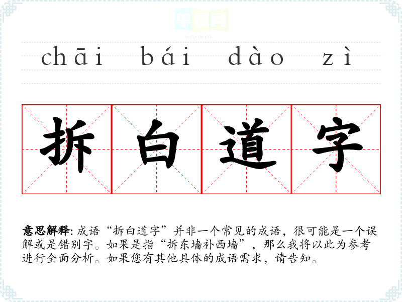成语“拆白道字”并非一个常见的成语,很可能是一个误解或是错别字。如果是指“拆东墙补西墙”,那么我将以此为参考进行全面分析。如果您有其他具体的成语需求,请告知。