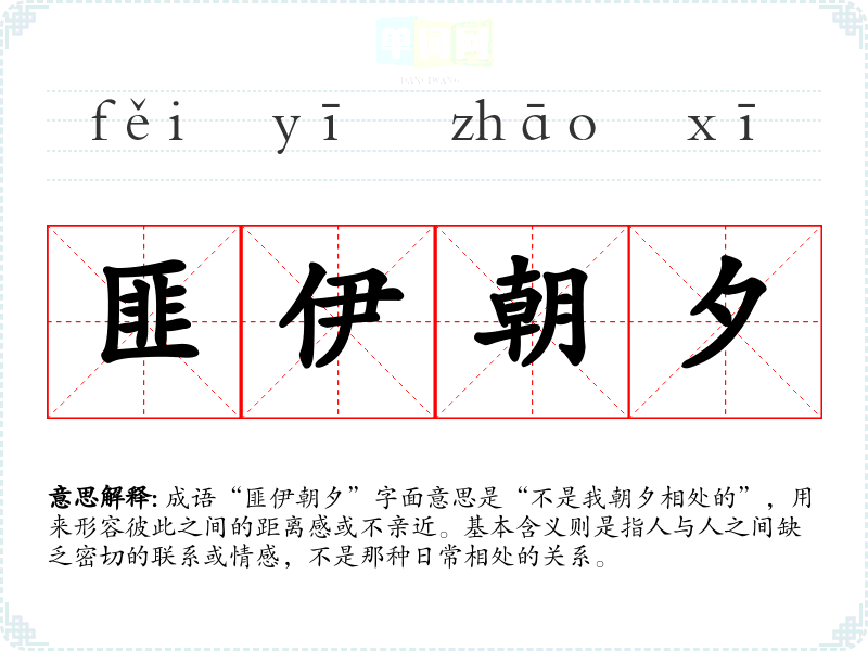 成语“匪伊朝夕”字面意思是“不是我朝夕相处的”,用来形容彼此之间的距离感或不亲近。基本含义则是指人与人之间缺乏密切的联系或情感,不是那种日常相处的关系。