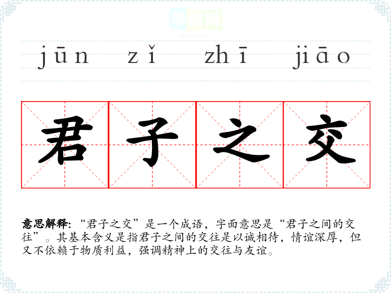 “君子之交”是一个成语,字面意思是“君子之间的交往”。其基本含义是指君子之间的交往是以诚相待,情谊深厚,但又不依赖于物质利益,强调精神上的交往与友谊。