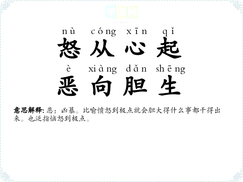| 怒从心起,恶向胆生 | 恶:凶暴。比喻愤怒到极点就会胆大得什么事都干得出来。也泛指恼怒到极点。 |