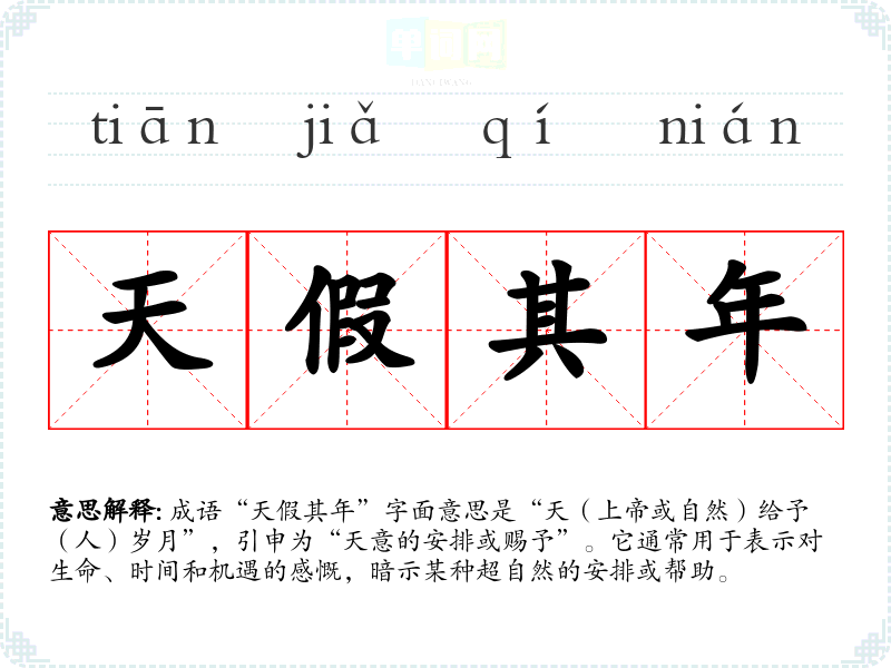 成语“天假其年”字面意思是“天(上帝或自然)给予(人)岁月”,引申为“天意的安排或赐予”。它通常用于表示对生命、时间和机遇的感慨,暗示某种超自然的安排或帮助。