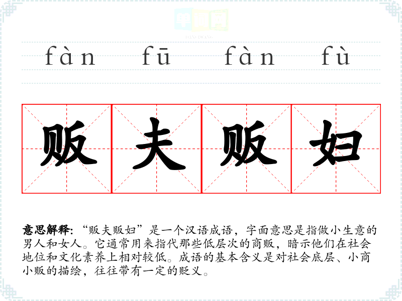 “贩夫贩妇”这个成语源自《史记·平原君赵成》,文中提到:普通的商贩都能与人交往,因此可以推断,贩夫贩妇指的是那些以小本生意为生的人。这个成语反映了古代社会中对商业活动的看法,尤其是对小商贩的身份和地位的认知,体现了社会阶层的分化。