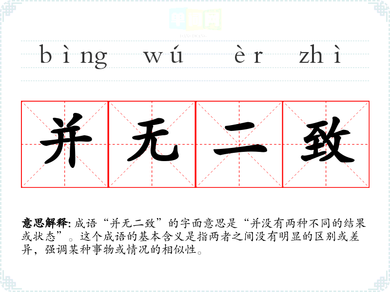 成语“并无二致”的字面意思是“并没有两种不同的结果或状态”。这个成语的基本含义是指两者之间没有明显的区别或差异,强调某种事物或情况的相似性。