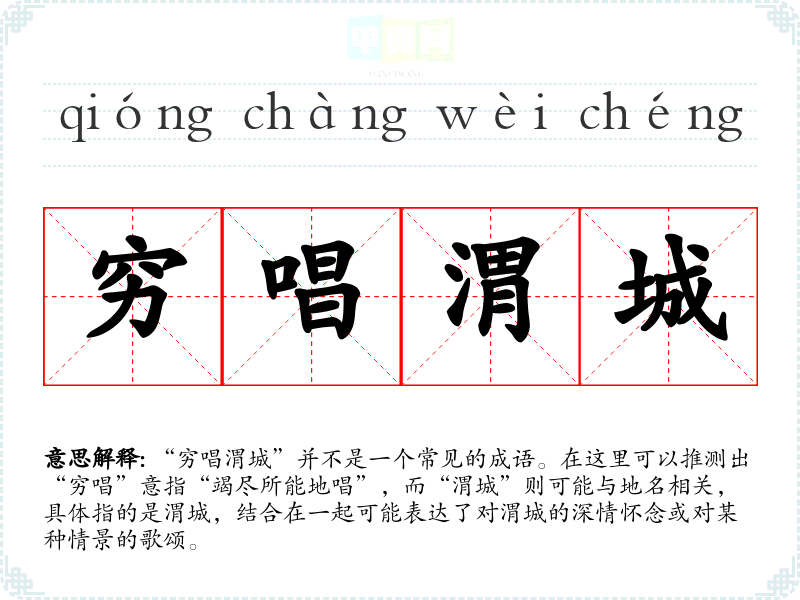 “穷唱渭城”并不是一个常见的成语。在这里可以推测出“穷唱”意指“竭尽所能地唱”,而“渭城”则可能与地名相关,具体指的是渭城,结合在一起可能表达了对渭城的深情怀念或对某种情景的歌颂。