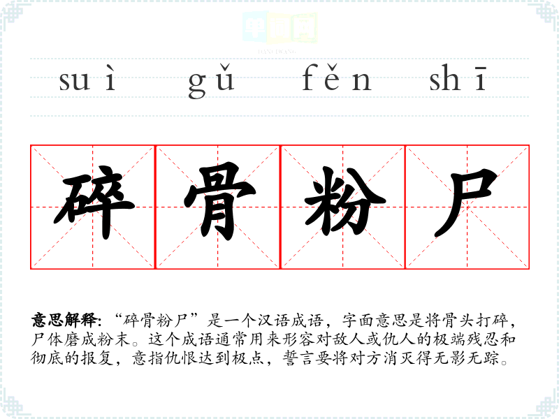 “碎骨粉尸”是一个汉语成语,字面意思是将骨头打碎,尸体磨成粉末。这个成语通常用来形容对敌人或仇人的极端残忍和彻底的报复,意指仇恨达到极点,誓言要将对方消灭得无影无踪。
