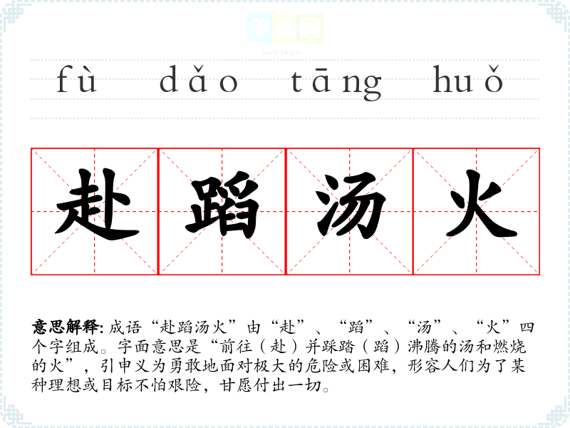 | 赴蹈汤火 | 赴:前往;蹈:踩;汤:热水。形容不畏艰难险阻,奋不顾身。 |