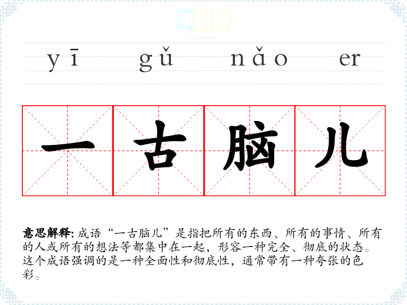 成语“一古脑儿”是指把所有的东西、所有的事情、所有的人或所有的想法等都集中在一起,形容一种完全、彻底的状态。这个成语强调的是一种全面性和彻底性,通常带有一种夸张的色彩。