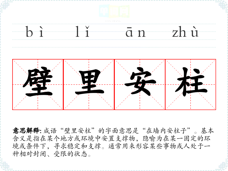 成语“壁里安柱”的字面意思是“在墙内安柱子”。基本含义是指在某个地方或环境中安置支撑物,隐喻为在某一固定的环境或条件下,寻求稳定和支撑。通常用来形容某些事物或人处于一种相对封闭、受限的状态。