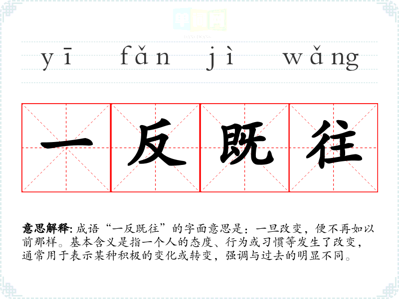 成语“一反既往”的字面意思是:一旦改变,便不再如以前那样。基本含义是指一个人的态度、行为或*惯等发生了改变,通常用于表示某种积极的变化或转变,强调与过去的明显不同。