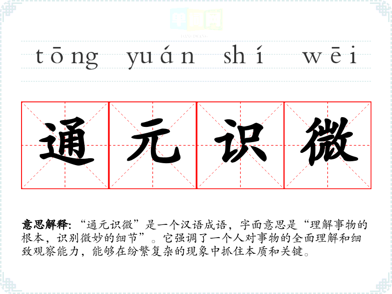 “通元识微”是一个汉语成语,字面意思是“理解事物的根本,识别微妙的细节”。它强调了一个人对事物的全面理解和细致观察能力,能够在纷繁复杂的现象中抓住本质和关键。