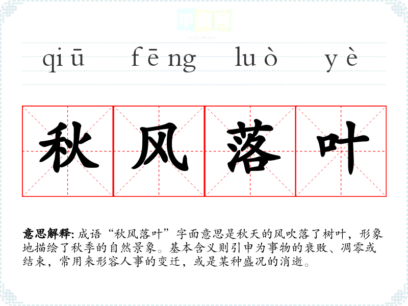 成语“秋风落叶”字面意思是秋天的风吹落了树叶,形象地描绘了秋季的自然景象。基本含义则引申为事物的衰败、凋零或结束,常用来形容人事的变迁,或是某种盛况的消逝。