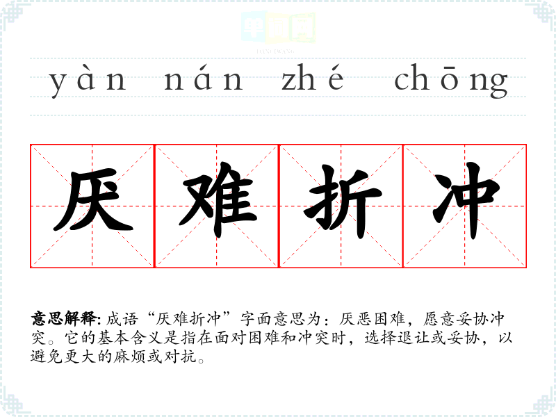 成语“厌难折冲”字面意思为:厌恶困难,愿意妥协冲突。它的基本含义是指在面对困难和冲突时,选择退让或妥协,以避免更大的麻烦或对抗。