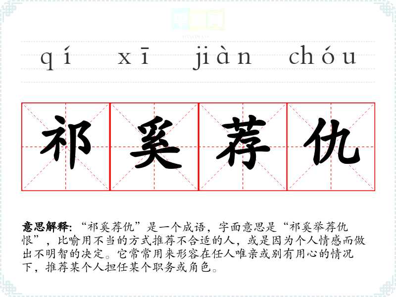 “祁奚荐仇”是一个成语,字面意思是“祁奚举荐仇恨”,比喻用不当的方式推荐不合适的人,或是因为个人情感而做出不明智的决定。它常常用来形容在任人唯亲或别有用心的情况下,推荐某个人担任某个职务或角色。