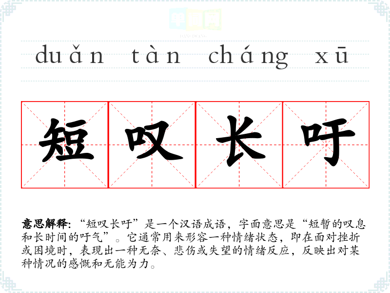 “短叹长吁”是一个汉语成语,字面意思是“短暂的叹息和长时间的吁气”。它通常用来形容一种情绪状态,即在面对挫折或困境时,表现出一种无奈、悲伤或失望的情绪反应,反映出对某种情况的感慨和无能为力。