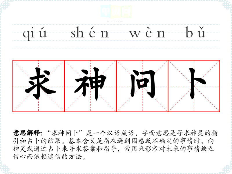 | 求神问卜 | 迷信的人遇有疑难,求神鬼帮助,或靠卜卦解决。 |