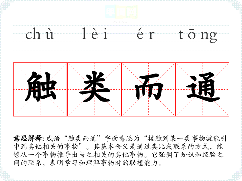 成语“触类而通”字面意思为“接触到某一类事物就能引申到其他相关的事物”。其基本含义是通过类比或联系的方式,能够从一个事物推导出与之相关的其他事物。它强调了知识和经验之间的联系,表明学*和理解事物时的联想能力。