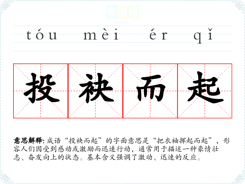 成语“投袂而起”的字面意思是“把衣袖挥起而起”,形容人们因受到感动或激励而迅速行动,通常用于描述一种豪情壮志、奋发向上的状态。基本含义强调了激动、迅速的反应。