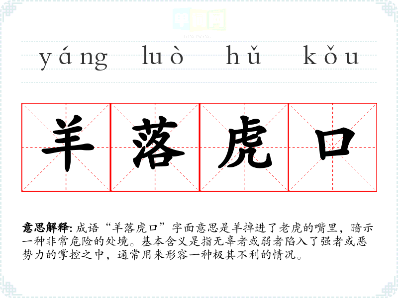 成语“羊落虎口”字面意思是羊掉进了**的嘴里,暗示一种非常危险的处境。基本含义是指无辜者或弱者陷入了强者或恶势力的掌控之中,通常用来形容一种极其不利的情况。