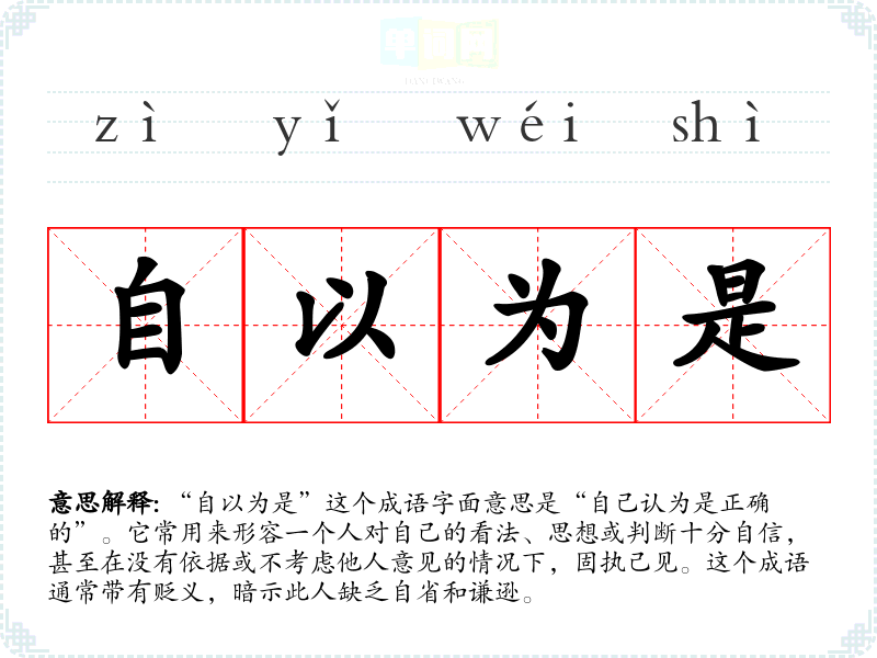“自以为是”这个成语字面意思是“自己认为是正确的”。它常用来形容一个人对自己的看法、思想或判断十分自信,甚至在没有依据或不考虑他人意见的情况下,固执己见。这个成语通常带有贬义,暗示此人缺乏自省和谦逊。