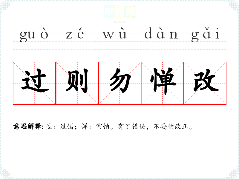 | 过则勿惮改 | 过:过错;惮:害怕。有了错误,不要怕改正。 |