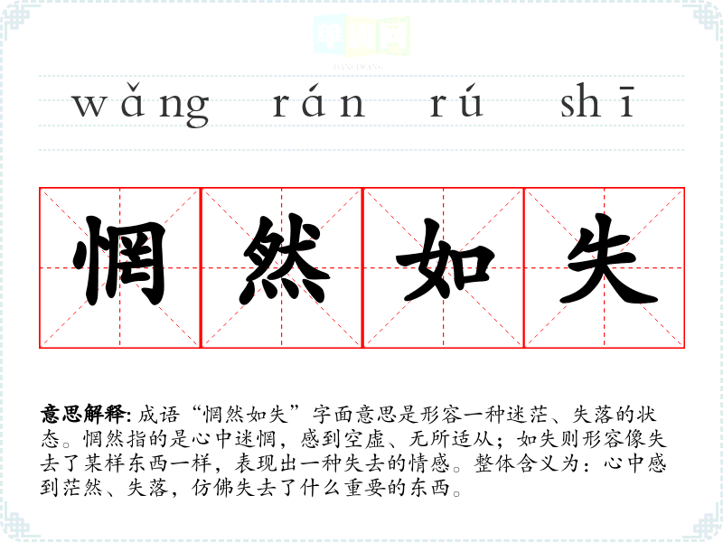 | 惘然如失 | 惘然:失意的样子。心情不舒畅,好像丢掉了什么东西似的。 |