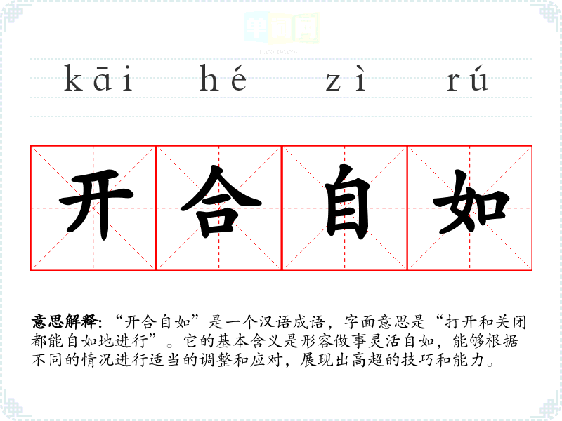 “开合自如”是一个汉语成语,字面意思是“打开和关闭都能自如地进行”。它的基本含义是形容做事灵活自如,能够根据不同的情况进行适当的调整和应对,展现出高超的技巧和能力。