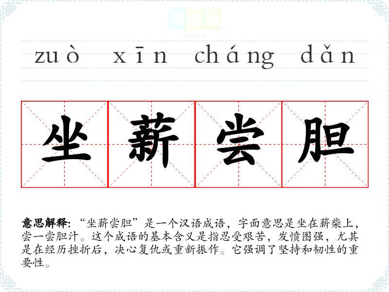 “坐薪尝胆”是一个汉语成语,字面意思是坐在薪柴上,尝一尝胆汁。这个成语的基本含义是指忍受艰苦,发愤图强,尤其是在经历挫折后,决心复仇或重新振作。它强调了坚持和韧性的重要性。