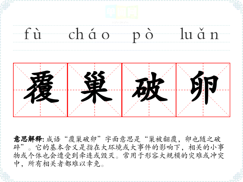 在文化中,成语“覆巢破卵”反映了对集体和个体命运紧密相连的深刻理解。在历史和社会变迁中,许多都表明个体在大环境下的脆弱性。现代社会中,此成语依然适用,尤其在讨论社会公正、政策实施等问题时,强调了影响的广泛性。