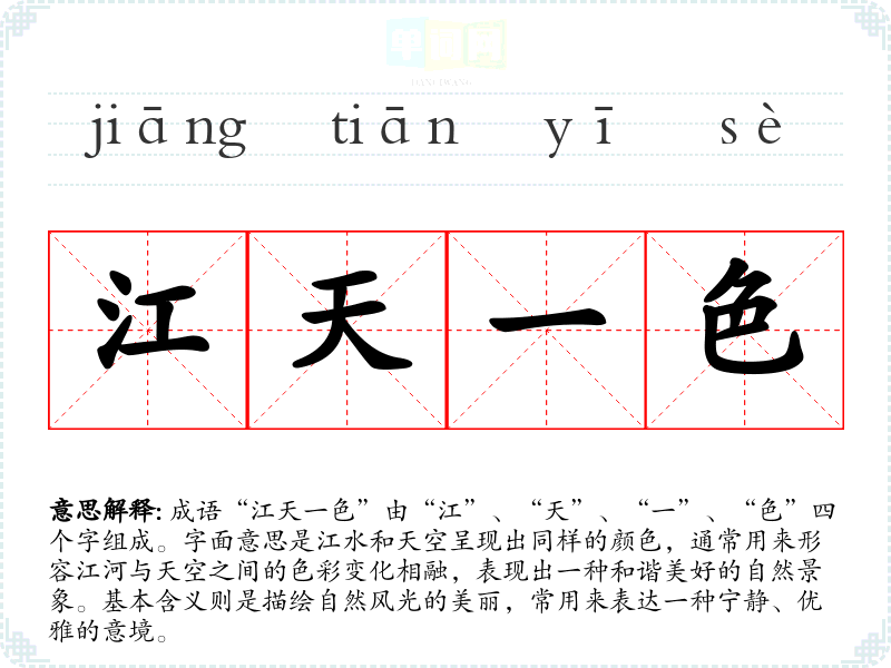 成语“江天一色”由“江”、“天”、“一”、“色”四个字组成。字面意思是江水和天空呈现出同样的颜色,通常用来形容江河与天空之间的色彩变化相融,表现出一种和谐美好的自然景象。基本含义则是描绘自然风光的美丽,常用来表达一种宁静、优雅的意境。