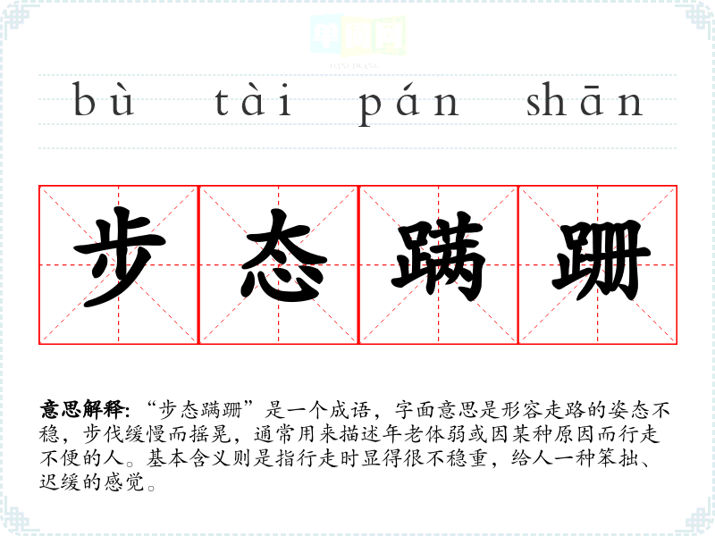 “步态蹒跚”是一个成语,字面意思是形容走路的姿态不稳,步伐缓慢而摇晃,通常用来描述年老体弱或因某种原因而行走不便的人。基本含义则是指行走时显得很不稳重,给人一种笨拙、迟缓的感觉。
