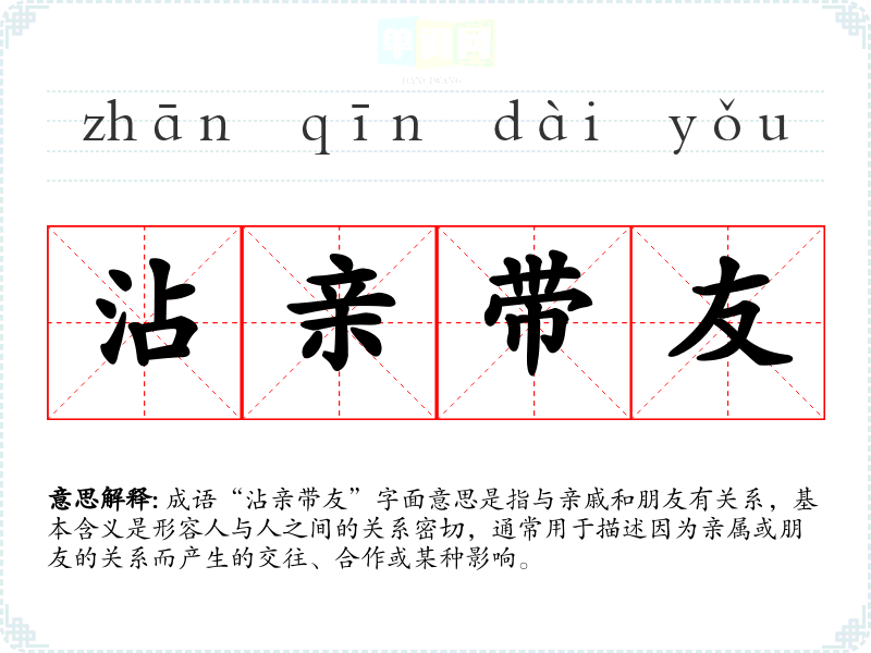 成语“沾亲带友”字面意思是指与亲戚和朋友有关系,基本含义是形容人与人之间的关系密切,通常用于描述因为亲属或朋友的关系而产生的交往、合作或某种影响。