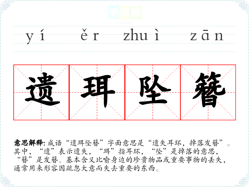成语“遗珥坠簪”字面意思是“遗失耳环,掉落发簪”。其中,“遗”表示遗失,“珥”指耳环,“坠”是掉落的意思,“簪”是发簪。基本含义比喻身边的珍贵物品或重要事物的丢失,通常用来形容因疏忽大意而失去重要的东西。