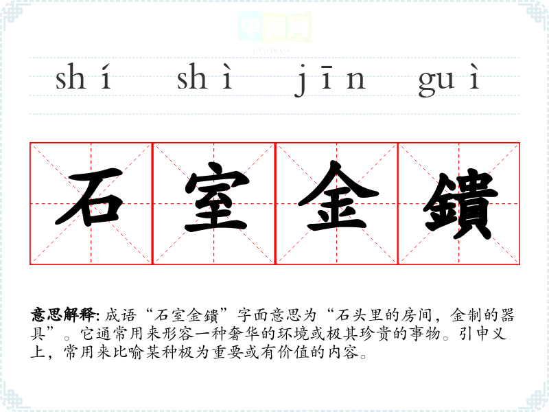成语“石室金鐀”字面意思为“石头里的房间,金制的器具”。它通常用来形容一种奢华的环境或极其珍贵的事物。引申义上,常用来比喻某种极为重要或有价值的内容。