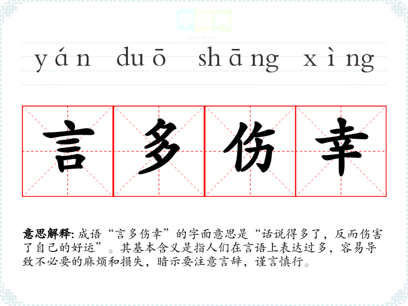 成语“言多伤幸”的字面意思是“话说得多了,反而伤害了自己的好运”。其基本含义是指人们在言语上表达过多,容易导致不必要的麻烦和损失,暗示要注意言辞,谨言慎行。