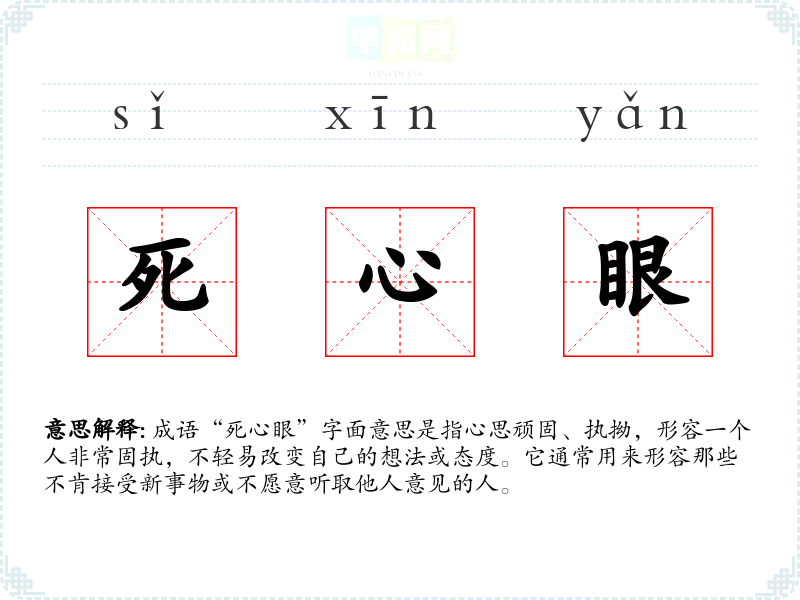 成语“死心眼”字面意思是指心思顽固、执拗,形容一个人非常固执,不轻易改变自己的想法或态度。它通常用来形容那些不肯接受新事物或不愿意听取他人意见的人。