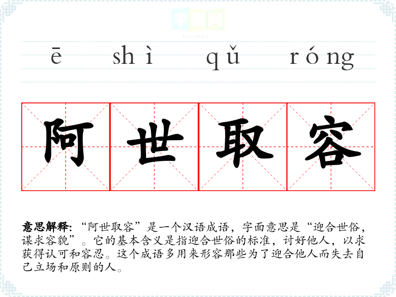 “阿世取容”是一个汉语成语,字面意思是“迎合世俗,谋求容貌”。它的基本含义是指迎合世俗的标准,讨好他人,以求获得认可和容忍。这个成语多用来形容那些为了迎合他人而失去自己立场和原则的人。